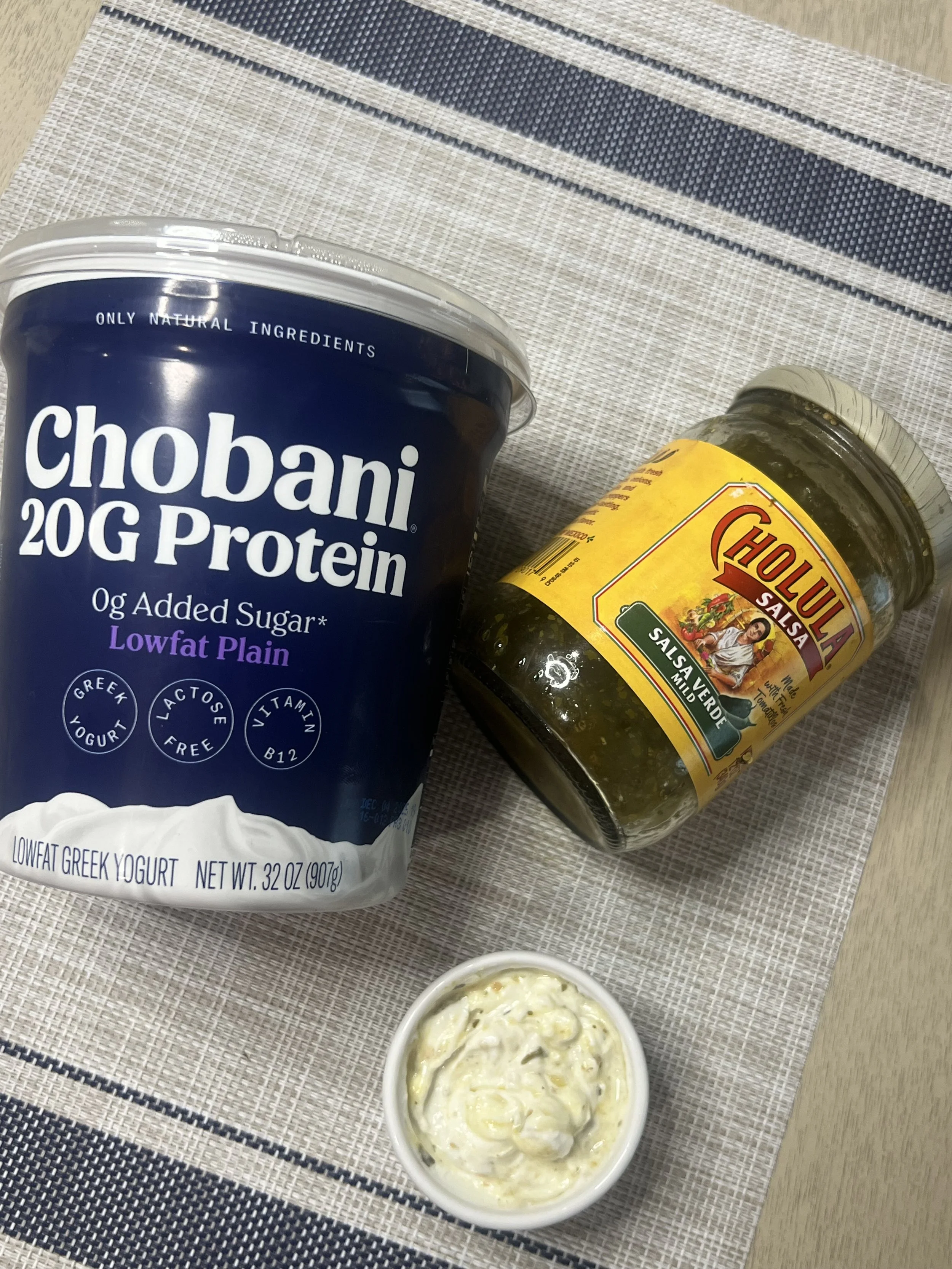 You can get as creative as you want with this. The yogurt acts as the sour cream so adding your favorite salsa, some granulated garlic, scallion and lime zest will make this dip fantastic with your fave tortilla chips, veggies, taco/burrito topping or a great mix in with chili! Makes 1 cup which is about 4 servings.